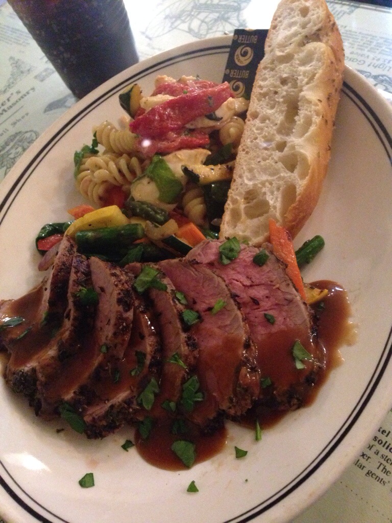 Herb roasted pork tenderloin, served with sauteed vegetables, roasted tomato and fresh mozzarella pasta salad and focaccia bread arrives ten minutes later. It is good. Not as good as the brisket (not much lately has been), but good. The pork tenderloin has a bit of brown gravy with a spicy bite to it, and is sliced into seven 1/4″ thick medallions. The pasta salad was the surprise hit of this plate – think a caprese salad (with the tomatoes roasted instead of fresh) and spiral pasta in a basil olive oil, served cold, and that’s pretty close. What a great lunch find.