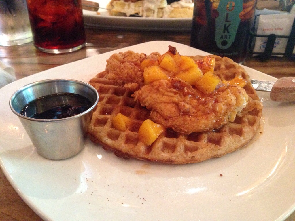 chicken (a fried chicken breast) and waffle, topped with a whiskey peach compote. This compote had a tart sweetness, with an undertone of whiskey, and mixed well with the fried chicken breast and waffle. The only complaint about this dish would be the thinness of the waffle. A Belgian waffle would have been perfect.