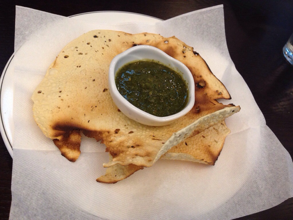 When I went back (with a different cohort this time) and sampled the menu, we started with a thin crispy butter naan with garlic and a tamarind sauce,