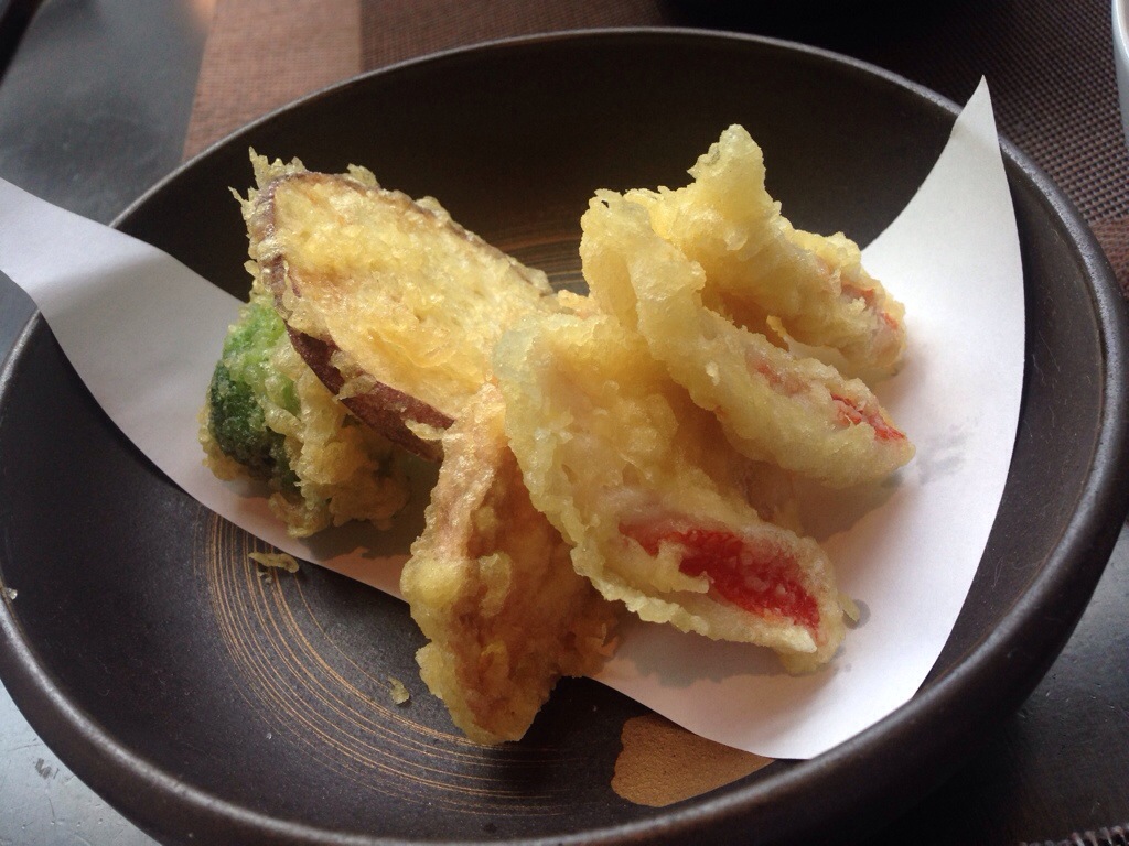 The tempura batter was slightly sweet and the fish was absolutely phenomenal – light and flaky. Looking up information about kimme-dai on the web leads to half a dozen references to Tomo, but most of the other links say that it is a golden-eyed snappers (there a couple of other options for the fish it could be, but I went with the consensus). Two of the vegetables were a mystery (we recognized the broccoli floret). After tasting and talking, we were still at a loss, so we flagged down a server – turns out they were slices of sweet potato and lotus root. Interesting tastes to both of them.