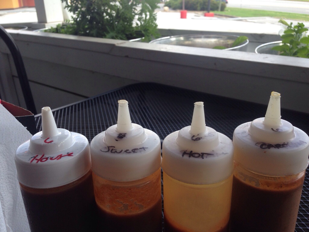 We arrived around 11:15, shortly after they opened and would have thought, by looking at the parking lot, that they weren’t open.  But the “Open” sign in the window, and all of the employees’ cars parked in the shade along the back of the lot proved differently.  They told us to sit anywhere, so we took a spot on the porch as there was a nice breeze.  (“Nice breeze” is a gentle word for the wind that ultimately threw paper towels and menus all over the porch).  We started by ordering the pork skins, then I began a survey of the sauces: