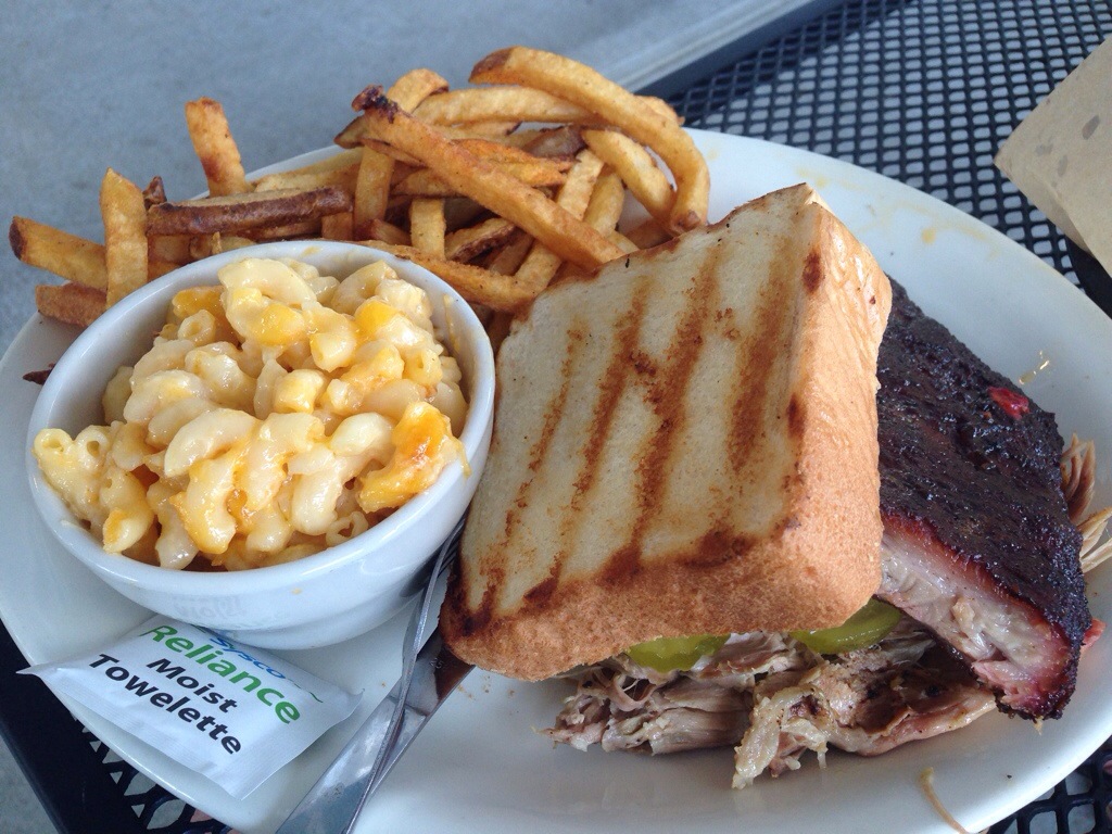 Jo ordered the 1/4 chicken, baked beans and cole slaw (I failed to get a picture of her meal).  I ordered the Lil’ Smokey (2 meat / 2 sides combo), with pulled pork and ribs, fries and mac and cheese.  They do have a “Pitmaster” plate with four meats and two sides, which we separately considered sharing, but neither mentioned.