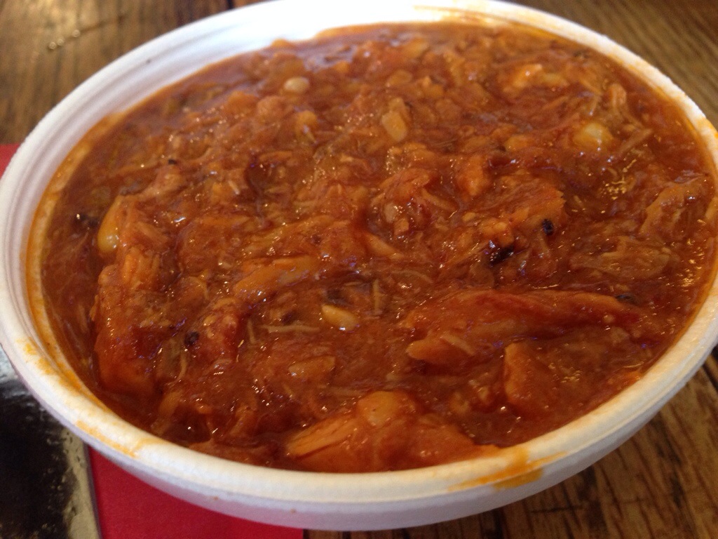 with a beautiful smoke ring, very meaty and smoky tasting. The meat pulled away from the bone with just the right “tug”. I’ll be having those on a return visit. The sauces complemented the meats well, particularly the Mountain Sauce on the ribs. The Brunswick stew was thick, slightly sweet and very meaty.