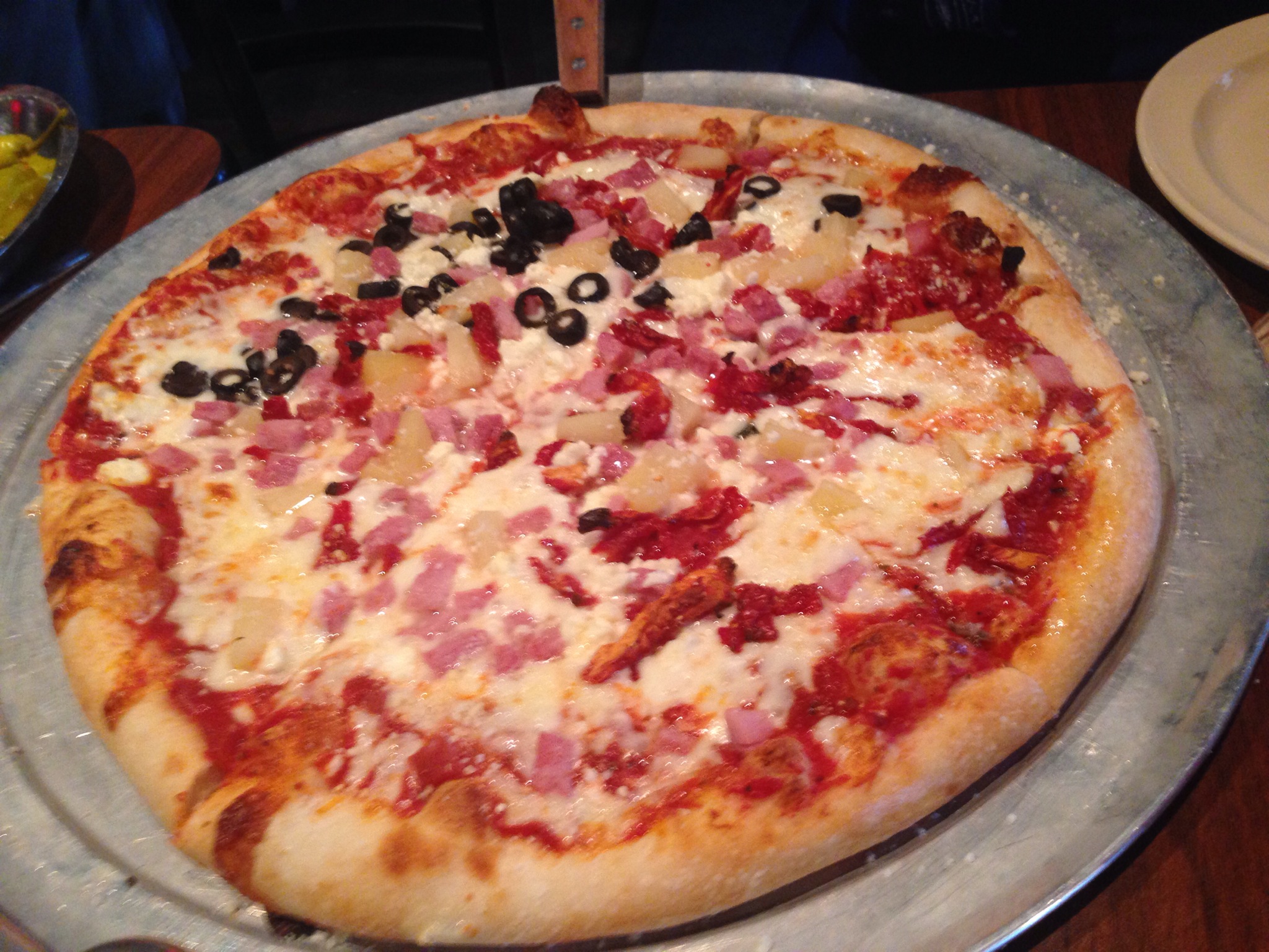 The ladies ordered an Oz Special – Canadian bacon, pineapple, feta cheese and sun-dried tomatoes, with black olives added to one half. The gents decided on a Hercules – pepperoni, Italian sausage, meatballs, Canadian bacon and extra mozzarella cheese, both large (16″) pies.