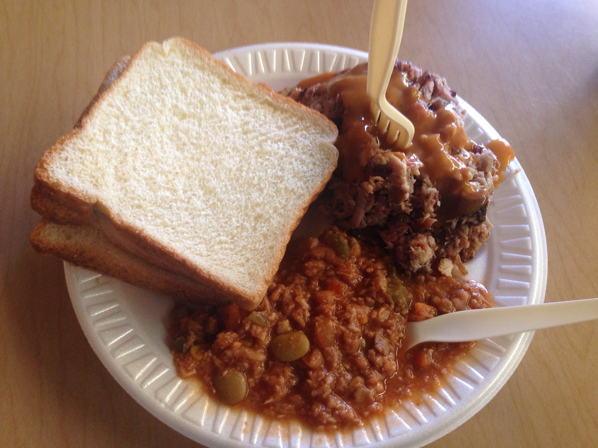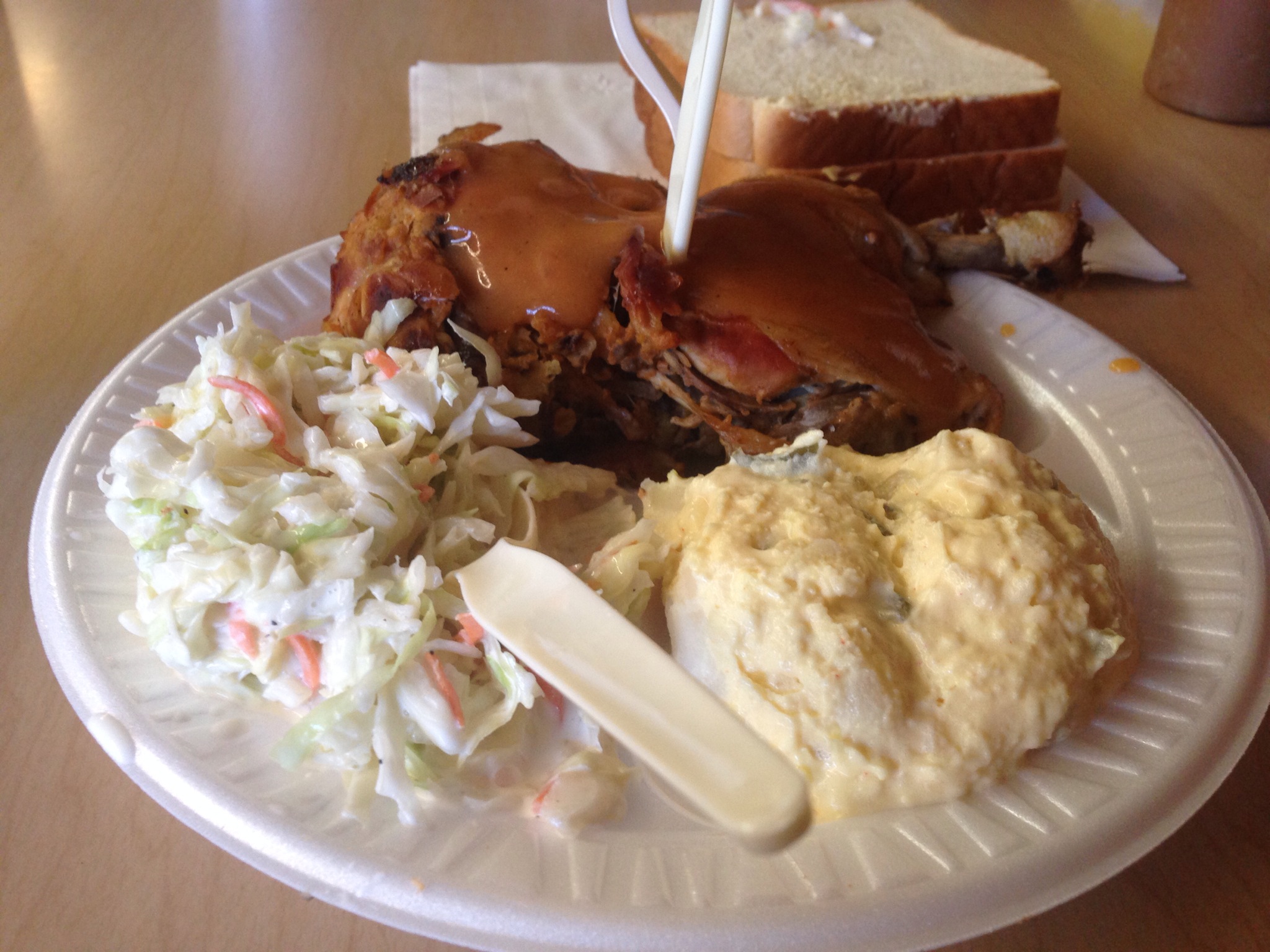 with slaw and potato salad (in the local vernacular, the lady calling the order in told the guy behind the counter “chicken with cold sides”). The slaw was declared “spot on” by the family slaw expert, while the potato salad was okay, but with more mashed potatoes than chunks. The chicken was very good (which made it much better than the pork, which was merely fine). They only had one sauce, which was thick and mustardy sweet. This made it a much better condiment for the chicken, than for the pork, in my opinion. Each plate was served with three slices of Sunbeam white bread. (You can see it in all of their signage and there were shelves full of the gooey white stuff).