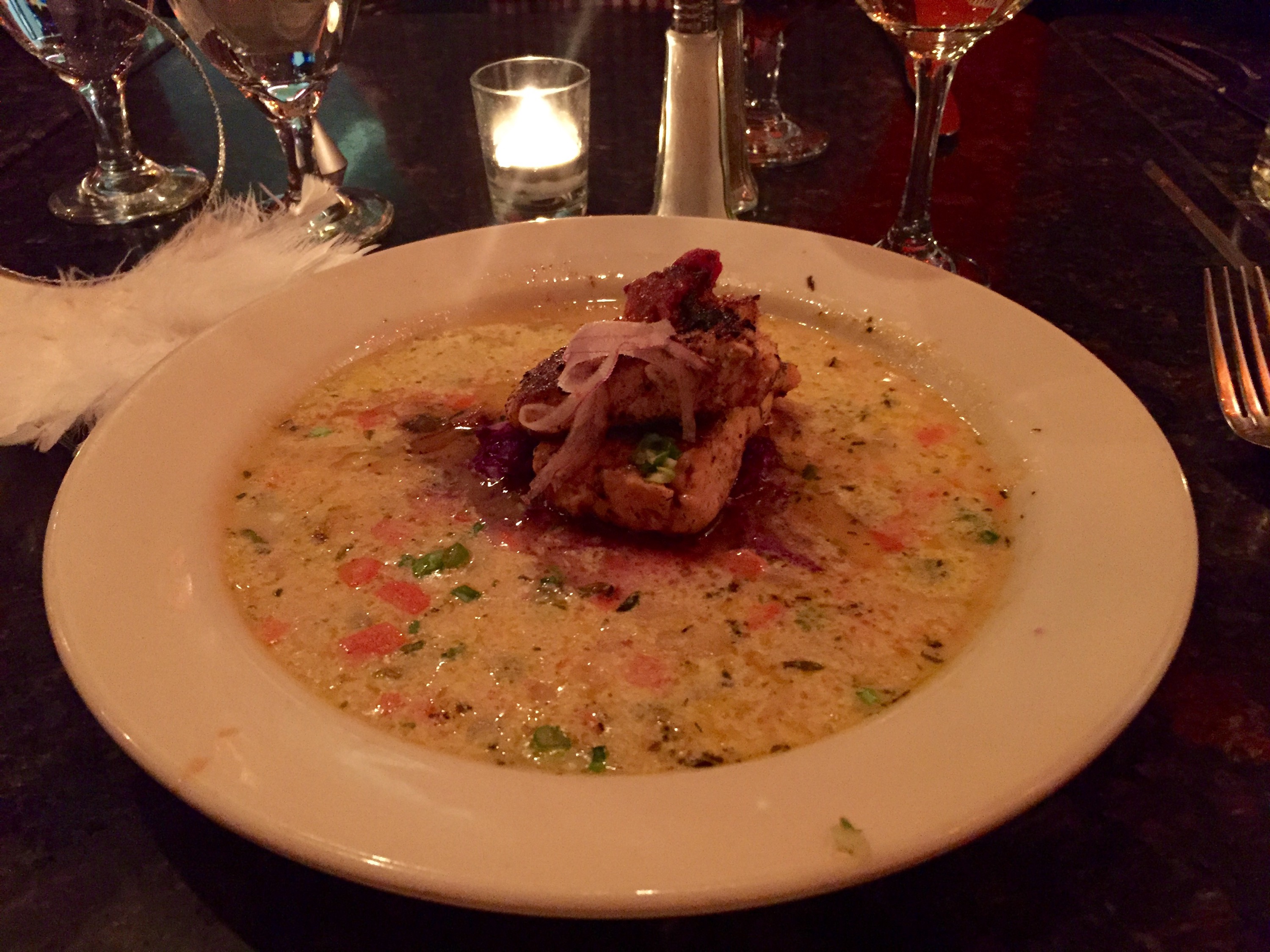 After grilling our server, Tosha, about the menu we learned that their top selling item is the Hudson County Fried Chicken and that their burger was voted “Best Burger” by GA Voice. I was tempted by the burger, but did not succumb, although two of our table mates did. We started with the chorizo stuffed dates, topped with goat cheese and wrapped in bacon. These arrived, atop a bed of slaw.
