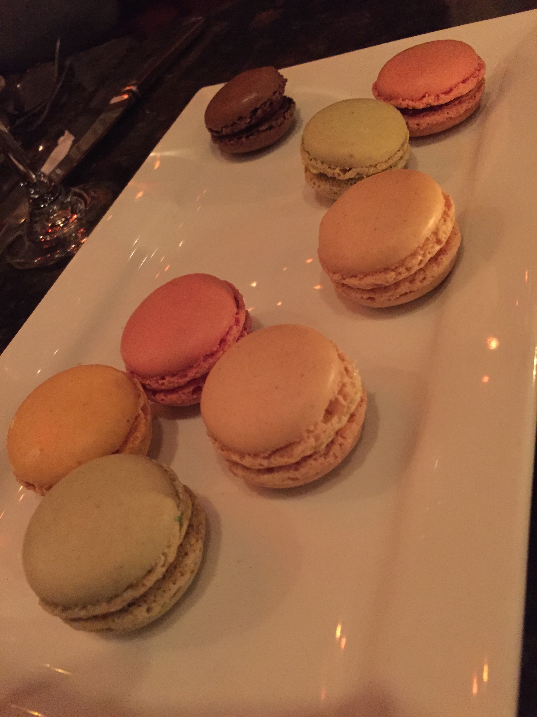 I cut it in half – quite a challenge, based on the thickness and the eggs trying to slide off the patty – for sharing. This was a hard-to-handle burger, and I recalled this advice and hooked my thumbs underneath, trying to keep it together. About halfway through the burger, which I was sharing with Jo (and offering to others) the chef came out of the kitchen. He said that our server was pressuring him to get this burger ready for Amanda Lotta Lamm (what he understood and I heard). It was actually for “the man that had the lamb”. The burger was tasty. After we finished, they brought a plate of macaroons to the table.
