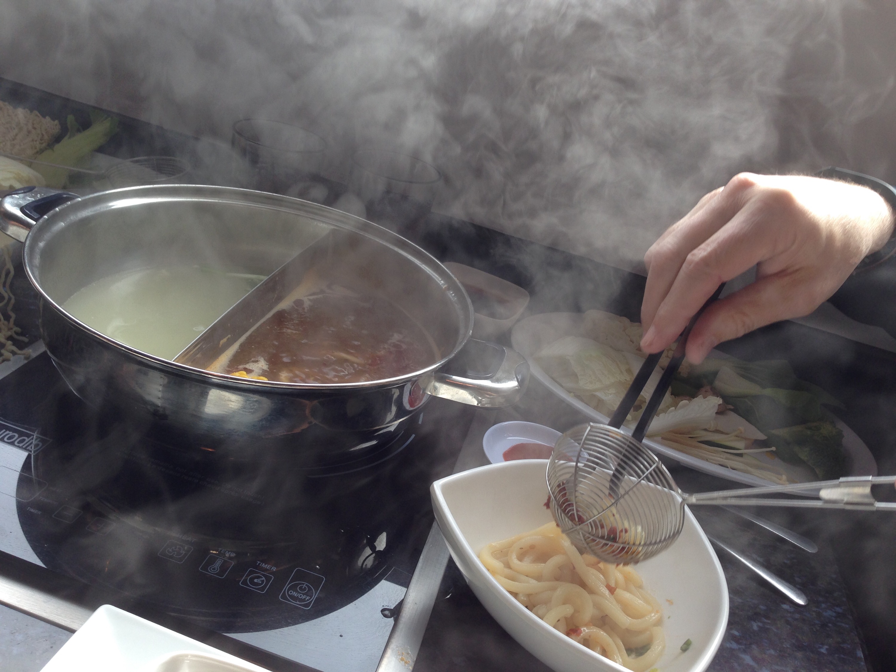 So I threw my udon into the pot and watched it bubble (I also ordered a second order of noodles). Silverware was sparse – a soup spoon and metal chopsticks. But the saving utensil was the strainer ladle – you could “fish” in your hot pots for what you were trying to dig out, rather than working the two-handed chopsticks trying to force noodles onto a spoon.