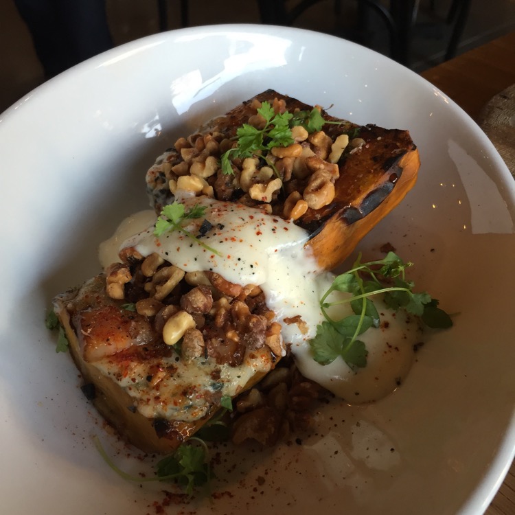 It was served with a green salad, which I passed along to the other side of the table.  It was mixed greens with red onions and a vinaigrette – simple but tasty.  We also chose to add a side, to share:  Butternut squash, topped with bleu cheese, walnuts and bacon.