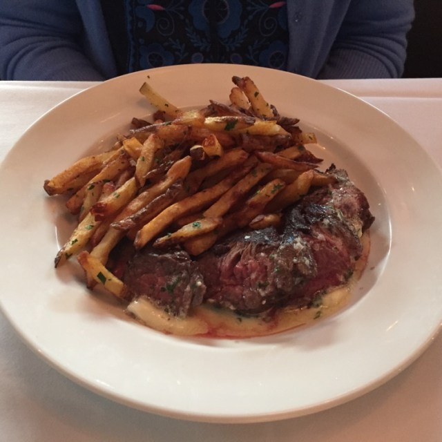 The menu is fairly limited, keeping with the brasserie nature, with several traditional entrees (confits, crepinettes and traillards). We chose to go with two classics. Jo chose the steak frites,