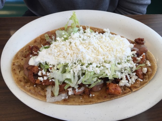 which was served with a lime and, oddly, a radish. It was good – the cilantro didn’t mix as well with the goat as it did with the pork (to me) – but the Al Pastor was better. While I was enjoying the tacos , Jo had a grilled chicken sope, a small fried round corn patty, with beans, cheese, lettuce and cream. I failed to get a picture of this but, visually, it was a cross between my next two plates. The corn patty was fairly thick, but the dish was tasty.