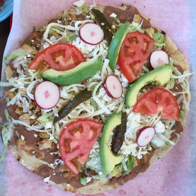And then arrived the king of a the table, the tlayuda. The difference in the tlayuda, huarache and sope had to do with the thickness of the corn tortilla (as listed above from thickest to thinnest), the overall size and the toppings. What we didn’t expect was that this plate was huge – it had, easily, a twelve inch diameter.