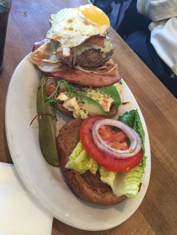 It varies daily, based on what’s fresh, in season and available and this day’s Sink had turkey, ham, jack cheese, avocado, bacon an egg salad derivative of some sort and sprouts. I was thinking about ordering the same, but was lured by one of the other burgers. When the Sink arrived across the table, it was huge – easily a five inch burger when fully assembled.