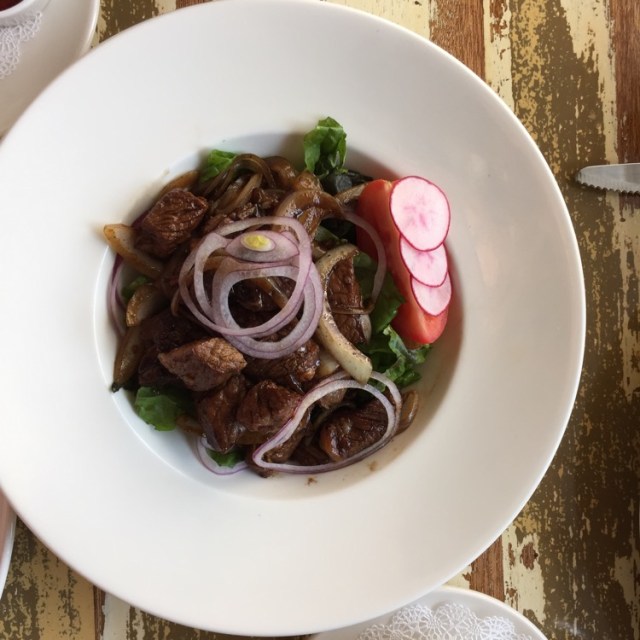 Bo luc lac (shaking beef), which was prepared with lettuces and a mix of vegetables) and was served with a bowl of jasmine rice and three sauces (sriracha, pickled jalapeños and a house-made chili oil).  It was also served with a blend of salt and pepper in  small dish, into which we were instructed to squeeze the slice of lime and dip the beef.  This dish, with a little of the chili oil (actually, a LOT of the chili oil – we had to ask for more) was fantastic.  We also shared