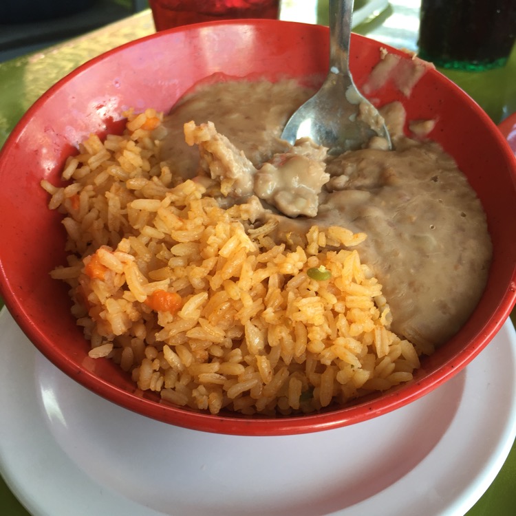which were served “street taco” style, with cilantro and onions. We also ordered a side of rice and beans to share