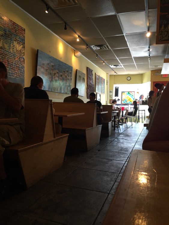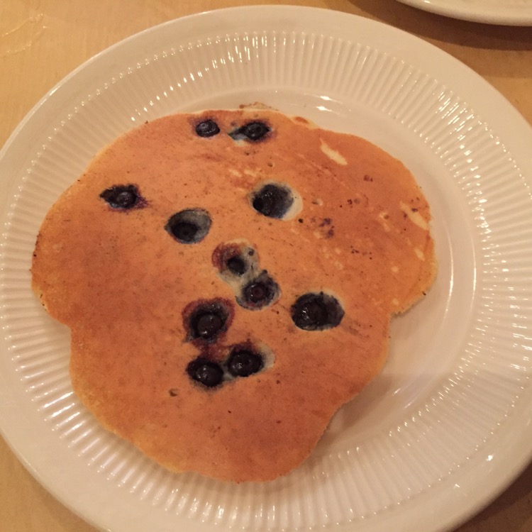 And we did. Arriving shortly before noon, the wait wasn’t too long (5 minutes?) and we were seated at a table for two along the interior wall that fronts the kitchen. Not wanting to make the mistake of “shorting” my mate on breakfast, I figured we were safe with here – they were serving both breakfast and lunch, at this time of day. One of the pleasant surprises on the menu is their serving of a “lonely” pancake or slice of French toast. Sometimes you want a pancake, but not “pancakes” and they recognize that. That allowed me to get a lonely blueberry pancake,