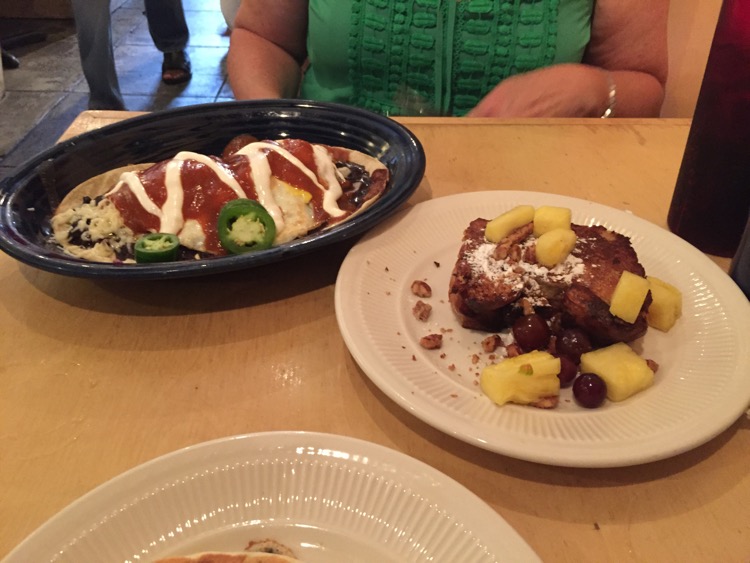 Jo ordered huevos rancheros and a lonely piece of French toast. The toast was made with bread pudding and a pecan struesel topping and served with bananas and blueberries. Other than remembering to order the huevos fried well, she really enjoyed her breakfast. The french toast was really bread pudding, the edges were crispy and she really liked the strusesel – “it was a win-win”.