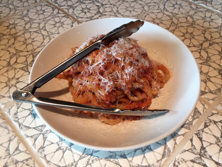 The pasta had also received good marks in the reviews I read.  So we ordered the house made bucatini (with pancetta, tomato, onion, black pepper, red chili and pecorino) as a starter, to share.  The sauce was thick and the dish was served piping hot.  The combination of the pancetta and chilies, along with the pecorino, made for a mix of flavor that was hot, meaty and fresh.  When the salad arrived, it resembled an antipasto (with cucumbers) and it was excellent (according to the three that ate it).