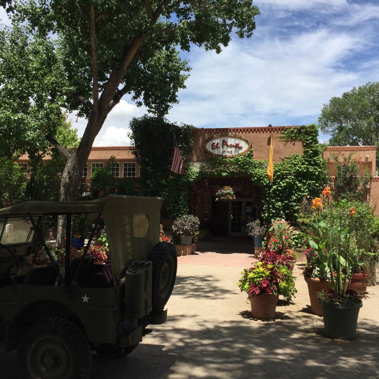 For our first meal on this road trip, before leaving, I googled for the best New Mexican restaurants in Albuquerque. One name was at or near the top of several lists and I confirmed it with the visitor center guy / gal at the airport – El Pinto Restaurant. Located in the North Valley, we drove about 20 minutes until we arrived at their location, near the Hot Air Balloon Park. The first thing we noticed was the size of the parking lot – this place was huge! Somewhere I’d read that it was the largest restaurant in the state of New Mexico, with nearly 11,000 square feet of dining space. Upon entering, we were asked if we wanted to sit inside or out, and even though it was over 90° the outdoor patio was cool. We took a seat at a table under a fan and this was our view.