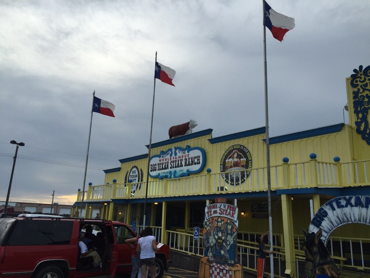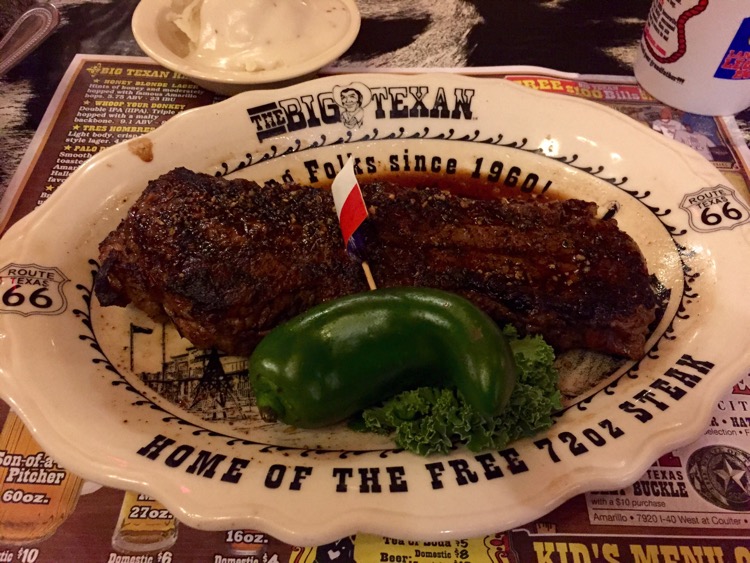 If you’ve driven through any parts of the American West, on or near I-40, you’ve likely seen the signs for the Big Texan Steak Ranch. And their 72 ounce steak challenge – eat the shrimp cocktail, baked potato, salad, with roll, butter, and of course the 72 oz. steak, in one hour, and it is free. Don’t eat it and you pay the full $72.00. We have some friends in Amarillo, so I asked my beloved what she’d think about asking the McGs to join us for dinner. She thought it was a neat idea. I thought that it might kitschy for them, but they were excited to join us, and plans were made.