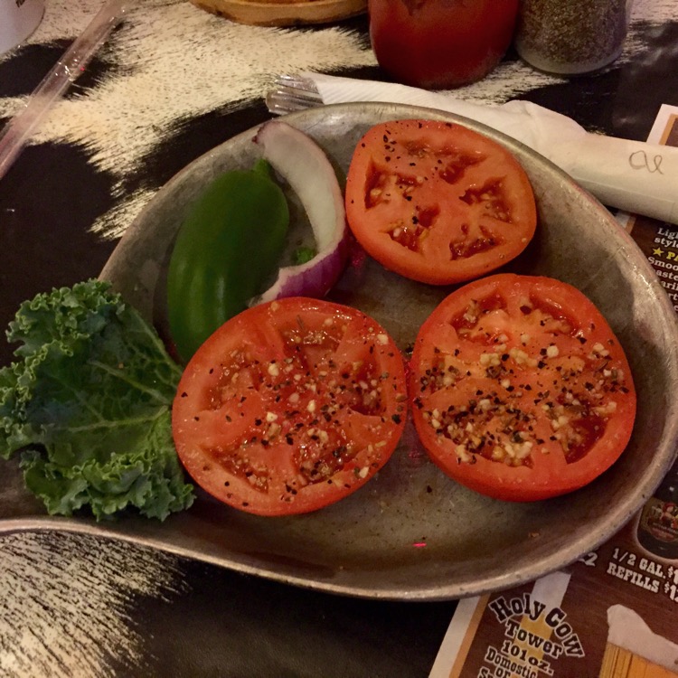 We decided that we’d call when we got close, and in my failure to note that we were losing an hour coming from New Mexico, we ended up arriving for dinner after 8:30. Crazy thing was, the place was packed. There were people all over the place, including a group of 30-ish from Australia, who were there to cheer on two of their mates in attempting the steak challenge. We sat down right after they started the clock and were finishing our meal when they finished the challenge. They both came up short – in fact, for one of them, the entire meal came up (they have a bucket for such a purpose right by the challenge table…)