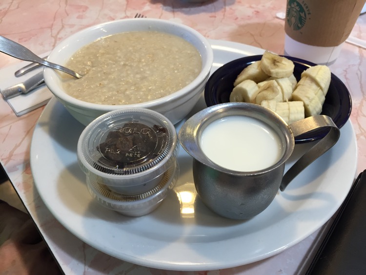 Glancing at each other, we joined two others at the nearly empty bar, taking a couple of stools right in front of the pass-through window from the kitchen. Jo ordered the oatmeal, which was served with bananas, raisins, brown sugar and milk.