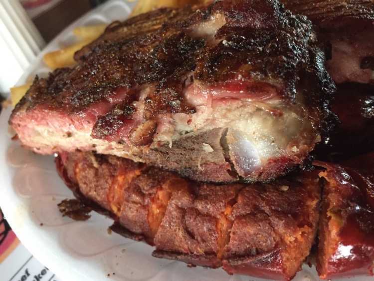 We ordered at the counter – to the right of the picture above and behind the open sign in the window in the top picture – and I settled on Leo’s Special (2 ribs, 2 links, brisket and bologna) with a side of fries. The photo above is of the brick heating pit in the middle of the restaurant. When he pulled out our brisket, the pitmaster was cleaver-chopping it with a fervor you usually only see in slasher movies.