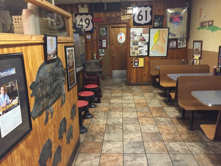 Walking in, it was “Four Until Late” afternoon, they were empty and they were scrambling to recover the hood from the roof to their smoker, which had blown off in this storm.  Abe’s is actually on the corner of the cross roads of Highways 49 and 61 – had this been our second visit, I would have titled it “Highway 61 Revisited”.