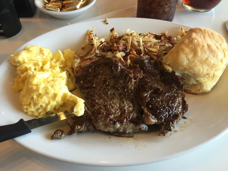 As the road trip winds to a close, we were looking for breakfast. I considered a smokehouse that we could see from our hotel room, but googled instead for the best breakfast in Birmingham and found Over Easy was both well rated and close by. We pulled up to a packed restaurant, in the Mountain Brook area, on Hollywood right by 280. We went inside and put our name in the hat and waited. They were so busy that the wait list included the counter – for a change I was glad not to sit at the counter, as the stools looked really low. Their slogan is “For People Who Love Breakfast” – I fit that bill.
