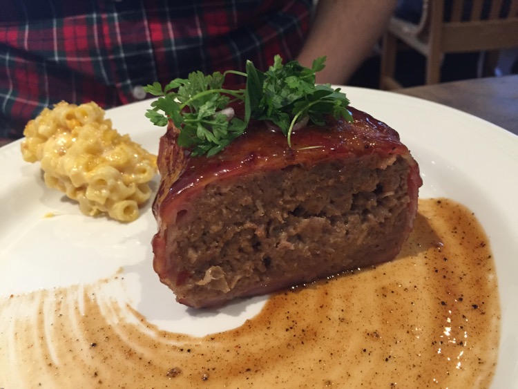 which was moist and well flavored. Jo gave me the leg and I gladly devoured it. Our son-in law had the grassfed beef and pork meatloaf, wrapped in bacon.