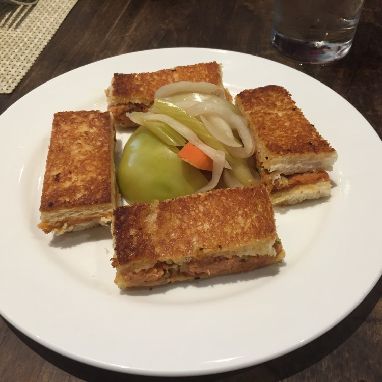 We were started out with the deviled ham tea sandwiches, served with pickled vegetables. These little bites were toasted perfectly and our son-in-law and I really enjoyed the deviled ham. I can’t say that I’ve had deviled ham in the last thirty years, maybe forty. And back then it was Underwood Deviled Ham in the white wrapper. This was a whole lot better. Full of the flavor of porky goodness, with a little “kick” at the end, I’d order it as an entree.