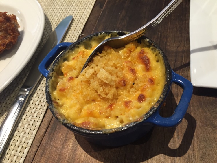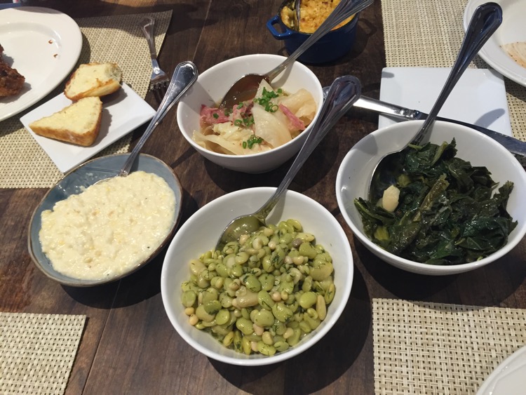 The sides arrived, starting with a pot of steaming macaroni and cheese for two (there was one for each side of the table). I don’t know how many cheeses were in this dish (I tasted at least two – a cheddar and something light and creamy), but there were no leftovers in either of these little bowls. The rest of the sides arrived, white cabbage with confit ham, hickory smoked local greens, field peas and butter beans in sweet cream butter with dill and creamed silver queen corn (starting at twelve o’clock in the picture below).
