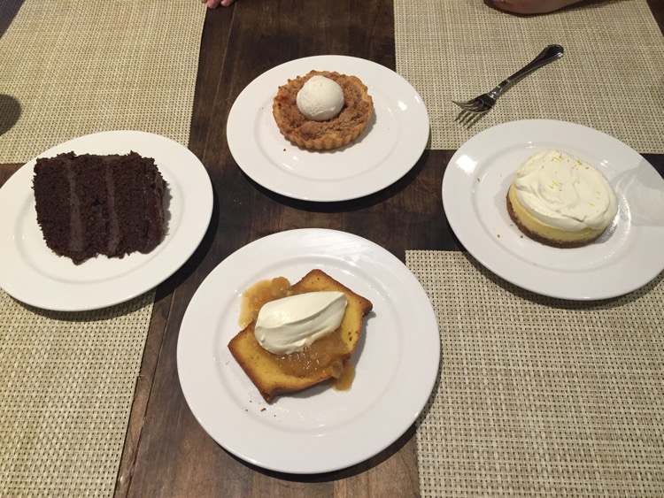 From top, going clockwise: Peach pie with almond butter ice cream; lemon ice box pie; Geneva’s (Kevin’s grandmother) toasted vanilla pound cake with pineapple and whipped cream; and “Awesome” chocolate cake (it had coffee in the icing). I ordered the lemon ice box pie and ate most of it, myself, while also sampling the peach pie (very good) and the toasted pound cake (even better). I passed on the chocolate, but it got rave reviews from the rest of the table.