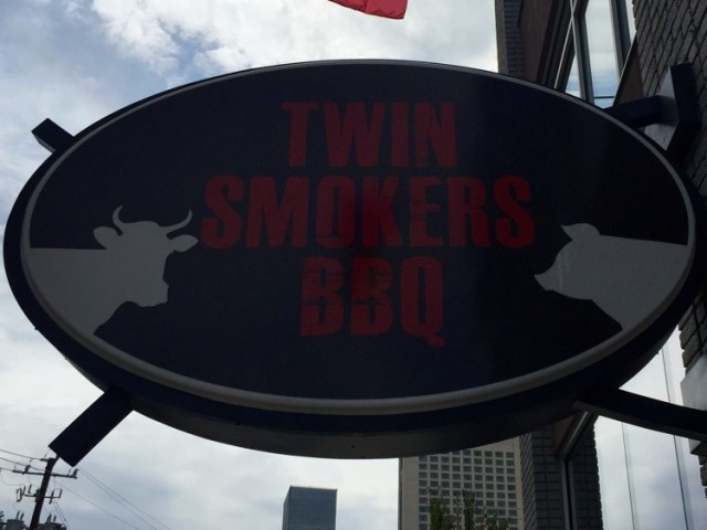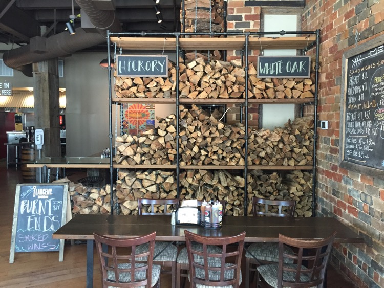 Twin Smokers BBQ opened last December on Marietta Street, near the Georgia Aquarium, but we had not had the chance to try them out yet. Today, as we headed to the airport for an afternoon flight, we ended up downtown, looking for food. As we drove down Marietta Street towards West Midtown, I saw their sign and pulled into the next parking lot that I saw. What I didn’t know was that parking at the Hilton Garden across the street is comped for three hours for the three restaurants in a row there – we found this out from the security guard in the lot we parked in. After I had just fed the meter. As we walked in, we were greeted by this wall of hickory and white oak (there’s another wall of Texas mesquite and post oak behind it) which feed the eponymous smokers.