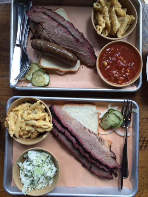 The twins, Matthew and Elizabeth, are used for different meats: they smoke pork and chicken in one (using hickory and white oak) and brisket and ribs in the other (using Texas mesquite and post oak). We ordered our meats and sides and took a seat at one of the long tables, which had tractor seat stools and waited. I took a taste tour of the sauces, while we waited.