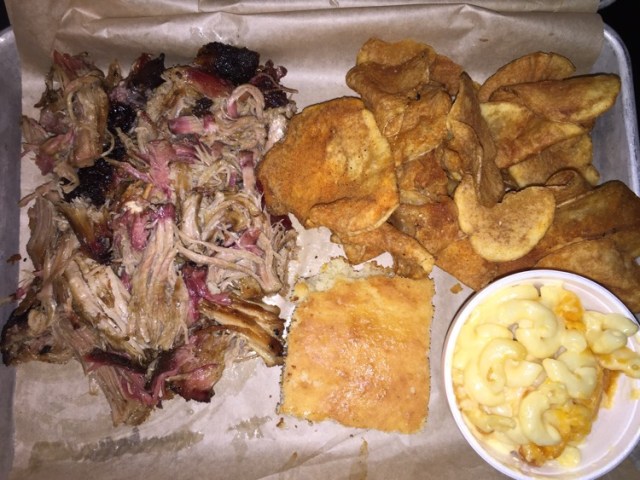 I ordered the pork and rib combo, intending to share the ribs with my dear, with sides of (house-made) potato chips and mac-n-cheese.