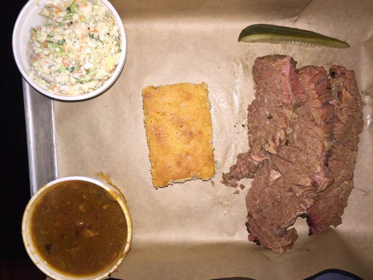 We took a few minutes to study the menu and quiz the (incredibly helpful) young lady behind the counter. My dear wife ordered the brisket, with slaw and baked beans – pretty much her standard order.