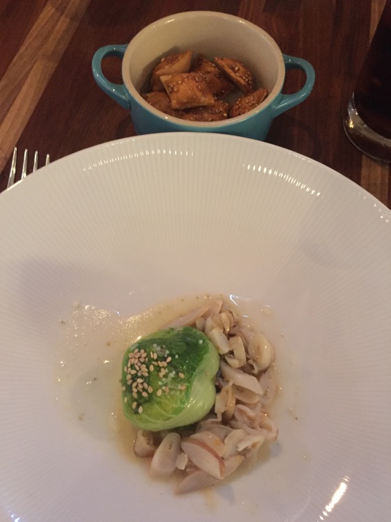 The plate arrived with a ball of Napa cabbage, wrapped around the rice, topped with benne crumbs and surrounded by razor clams. There was also a bowl of benne crackers. The benne, gold rice and clams is a very coastal Carolina style dish, as the benne seeds (we know the mature benne seeds as sesame) were brought to South Carolina plantations (and ultimately South Carolina dinner tables) from Africa by slaves. I’ve never really thought of myself as a “clam person”, as growing up in the Atlanta suburbs of the 60s and 70s, the only exposure I had to clams was the clam chowder at Red Lobster. Can you blame me? This dish, on the other hand, was phenomenal.