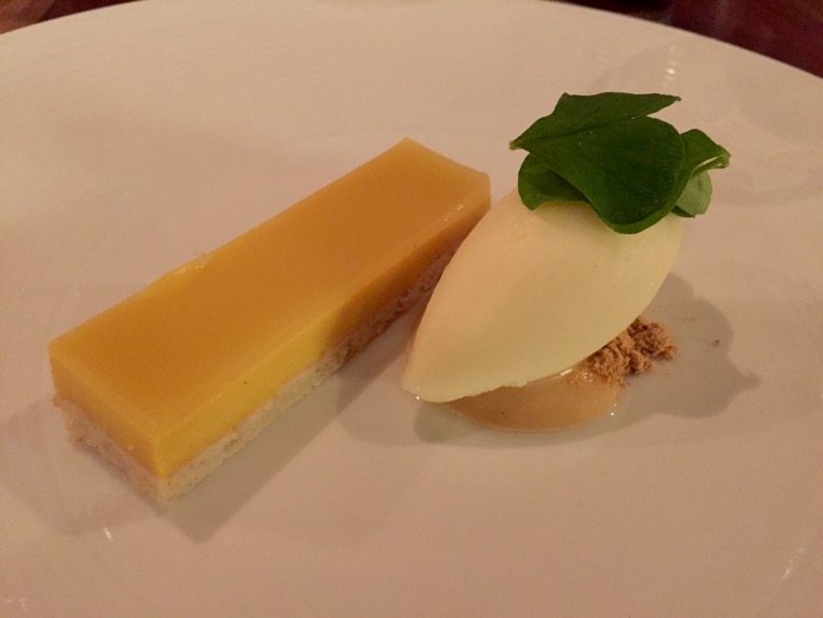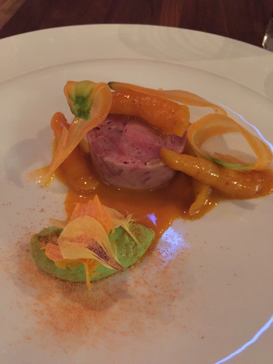 The third course arrived – a duck confit (I’d be eating two of these – my beloved does not eat duck), with carrots and nasturtium. Yep, nasturtium – a flower, served puréed with blossoms. I did get both confits, and sent my carrots across the table in exchange. If you aren’t familiar with confit, it’s a method of preserving and re-constructing meat, that’s very well described here.