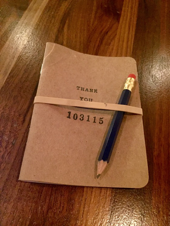 She said when later came, she understood, as it was filled with thoughts “for later” and that they were giving this notebook to diners to create their own journal (to write about dinner, to write about whatever, to play tic/tac/toe). Her openness, and poise, were touching – we were both tearing up while she spoke. Jo, being a crafter, who makes travelers’ journals, thought it a particularly nice touch.