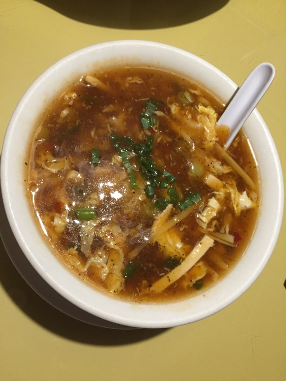 First to arrive was the compulsory bowl of kimchee, giving away the Korean nature of the place, despite the Chinese looking interiors – except for the giant plate glass window which looks into the kitchen, you’d think you were in any nice Chinese restaurant.   Ignoring the kimchi (which sat on the table like the elephant in the room), we waited instead for the hot and sour soup for two.
