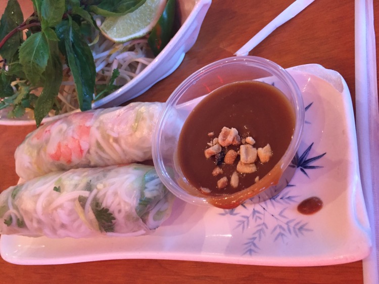 The boat of add-ins for the pho arrived first, shortly followed by the rolls that we ordered. (I heard that the jalapenos in the boats were really hot). We had an order of Gỏi Cuốn (shrimp & Vietnamese ham rolls) and an order of Gỏi Cuốn Gà (shredded chicken rolls). The picture below is of the former: