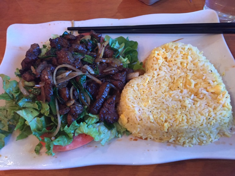 This dish seems so simple – beef, seared in oil in a very hot wok, in a sauce of fish sauce, soy sauce, rice wine vinegar and sugar, with onions and scallions, tossed (or shaken) together and served on a bed of lettuce (and, in this case, tomatoes), with rice. But it is so tasty – some times the simplest things are. It is served with a small container of salt and pepper with a slice of lime, which is used to make your own dipping sauce for the beef. This was well prepared and seasoned perfectly. I won’t hesitate to return when invited again.