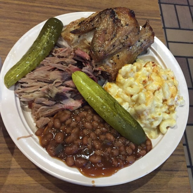 We split a platter – chicken and pork with mac-n-cheese and baked beans.
