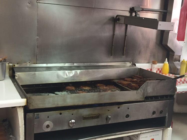 Notice the stack of burgers on the shelf to the right.   As I learned, by watching, the burgers were partially cooked and set aside on that shelf.  Then, when ordered, they were thrown back into the grease to be finished off.