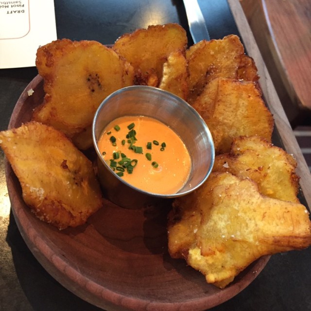 Note: share-able doesn’t mean that they are massive servings, but rather small plates that you can share amongst several folks. We ordered some tostones (fried plantains), which where served with an “oooeee” sauce. The sauce was like a spicy remoulade and these came to the table straight from the fryer, as they were Hot (that’s “hot” with a capital “H”).