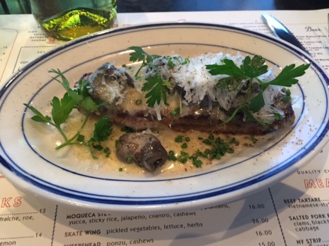 The menu is definitely seafood-centric, but there are a couple of land-based options. Next to arrive was my “entree”, a NY strip, served with buerre monte, escargots and crunchy toast.
