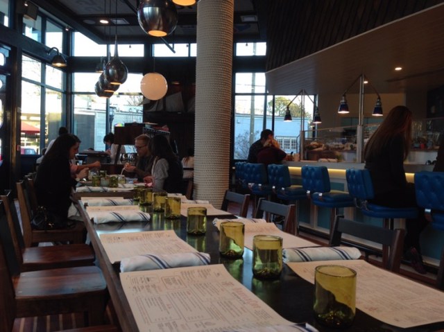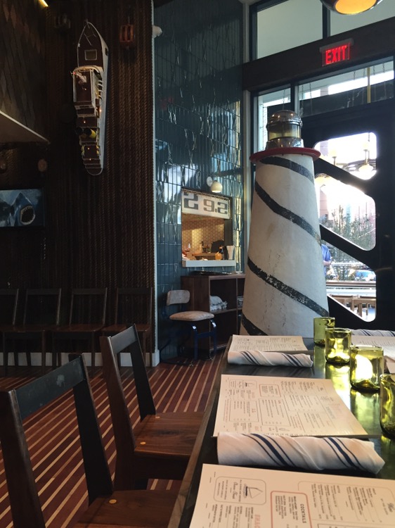 Dining is first come – first served, and we took the end two seats at one of the communal tables in the center. Upstairs, the theme is New England sea shore, replete with a nautical theme throughout, up to the sails that make up the ceiling cover. There’s bar seating, fronting the oyster bar and kitchen, on fabulous turquoise and chrome stools.