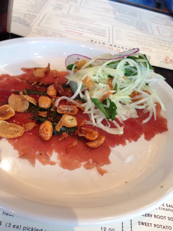 which was thin (like a carpaccio), with a Thai herb salsa verde, jalapeños, green papaya, peanuts and crispy shallots. The tuna was pounded paper thin and the mix on top really added to the flavor. One thing to pay attention to – food comes out as it is ready (not necessarily in the sequence you ordered it) and the plates are designed to be share-able.