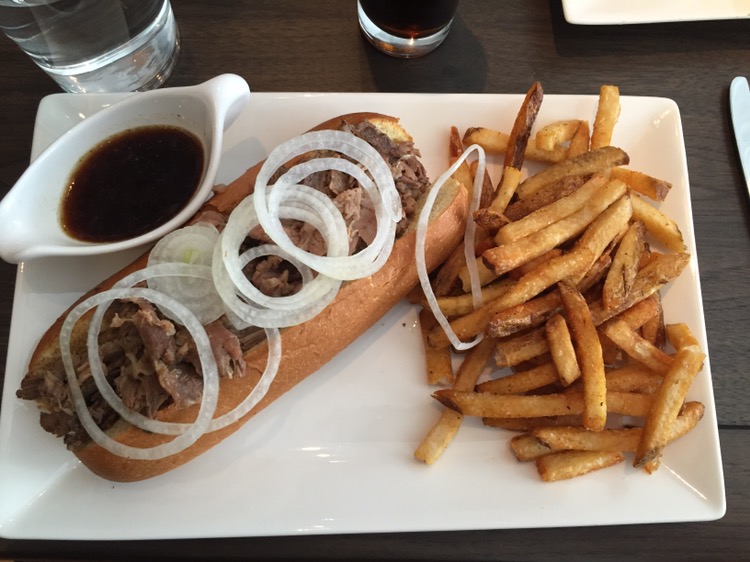 And I apparently upgraded from the waffle fries to their “3 day Merc fries”. I don’t know what exactly those are, but there was a two dollar up charge. The sandwich was served with a gravy boat of au jus, which was absolutely impossible to pick up – I dropped it onto the plate, splashing the sauce all over the place. Once the gravy hit the bread, it became impossible to pick up and this became a knife and fork sandwich.